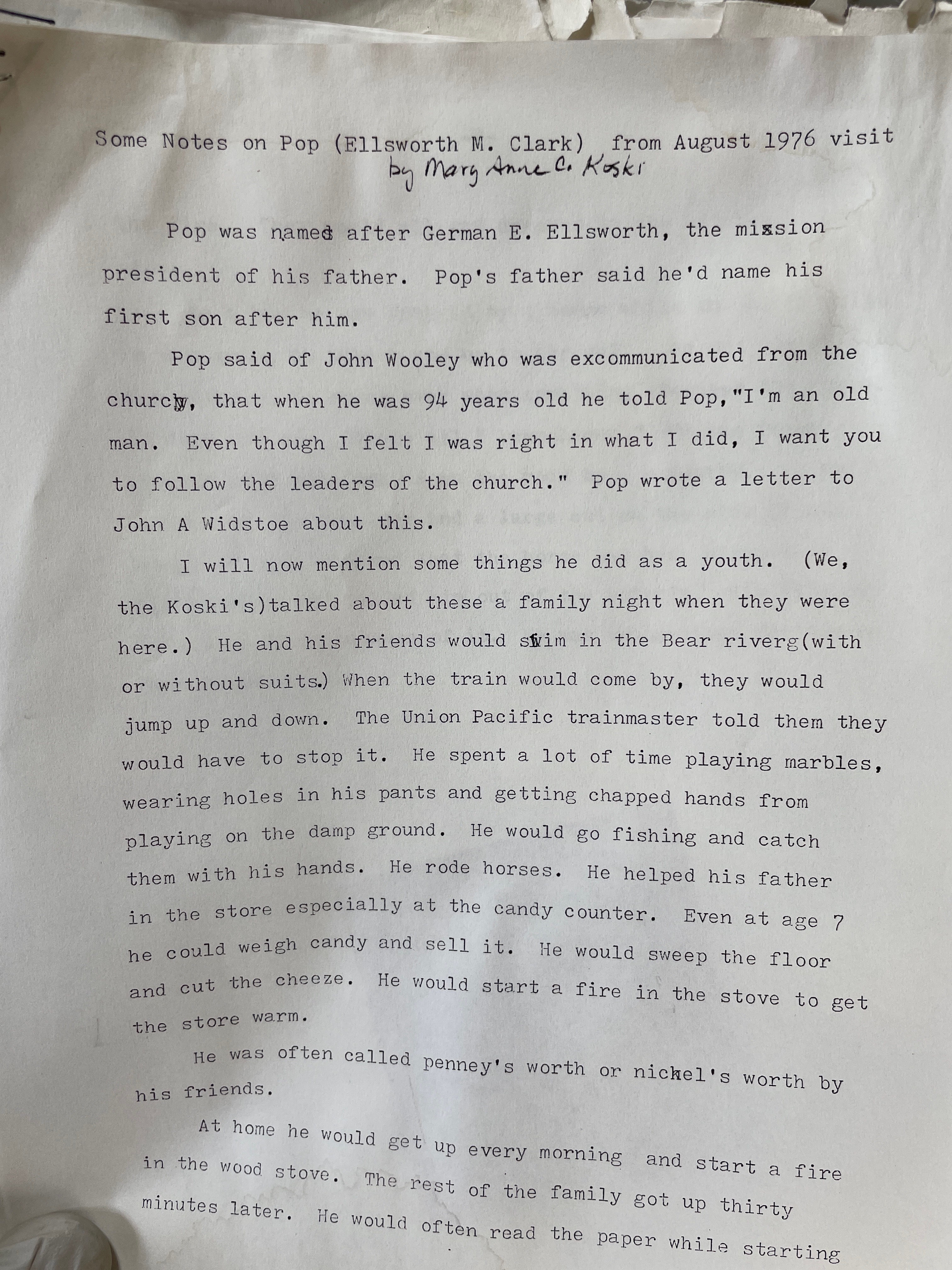 Some Notes on Pop (Ellsworth M. Clark) from August 1976 visit by Mary Anne C. Koski [Daughter]