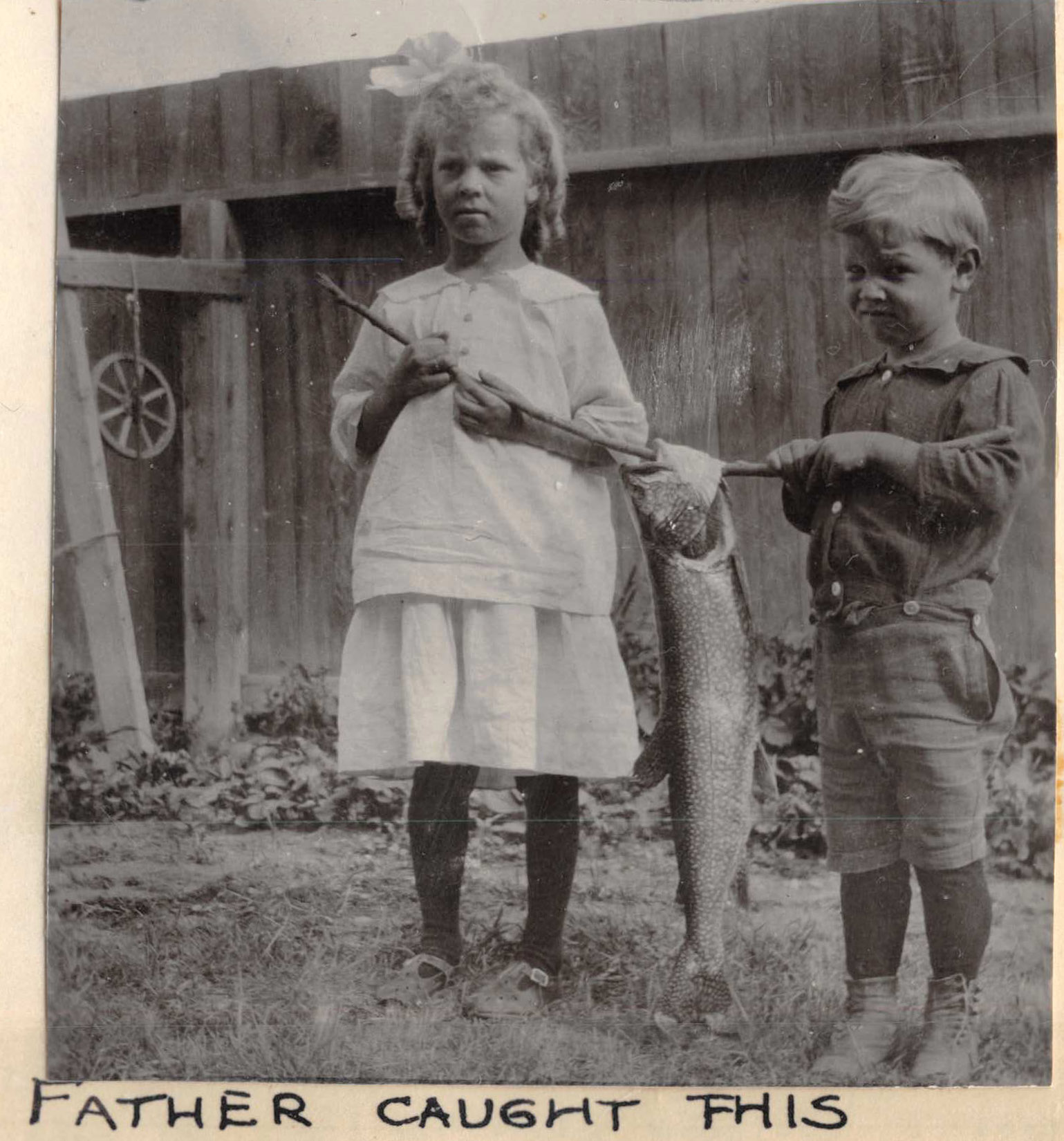 photo of Dorothy and Oliver Smith as children holding a large fish on a stick. In Dorothy's document, "Sketch of my Life" she indicated to use this photo describing what she and her siblings did in the summer months.