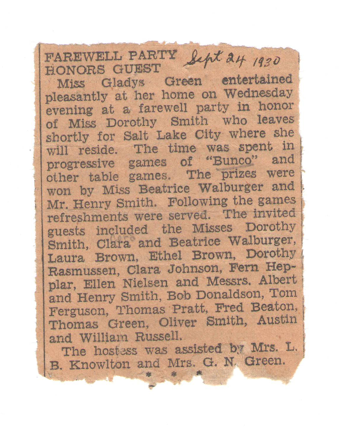 Miss Gladys Green entertained pleasantly at her home on Wednesday evening at a farewell party in honor of Miss Dorothy Smith who leaves shortly for Salt Lake City where she will reside. The time was spent in progressive games of "Bunco" and other table games. The prizes were won by Miss Beatrice Walburger and Mr. Henry Smith. Following the games refreshments were served. The invited guests included the Misses Dorothy Smith, Clara and Beatrice Walburger, Laura Brown, Ethel Brown, Dorothy Rasmussen, Clara Johnson, Fern Hepplar, Ellen Nielsen and Messrs. Albert and Henry Smith, Bob Donaldson, Tom Ferguson, Thomas Pratt, Fred Beaton, Thomas Green, Oliver Smith, Austin and William Russell.