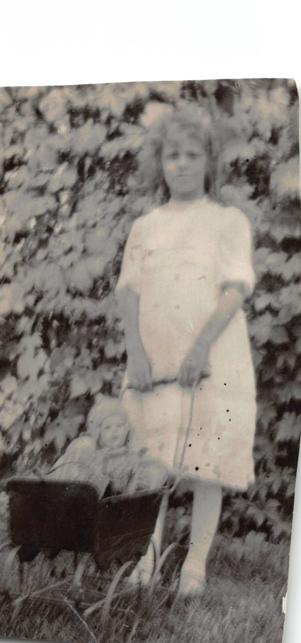 Dorothy Smith with her doll and buggy in front of her home in Lethbridge, Alberta.